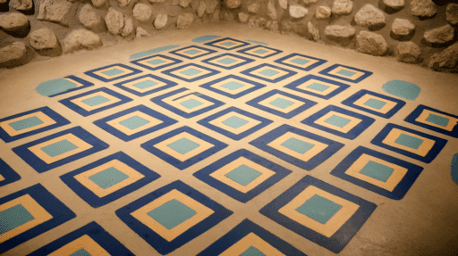 A basement with a stained concrete floor. The floor is deep blue and decorated with white patterns. The walls are painted beige and have a few nails on them. There is a white chair in the corner. The lighting is bright.