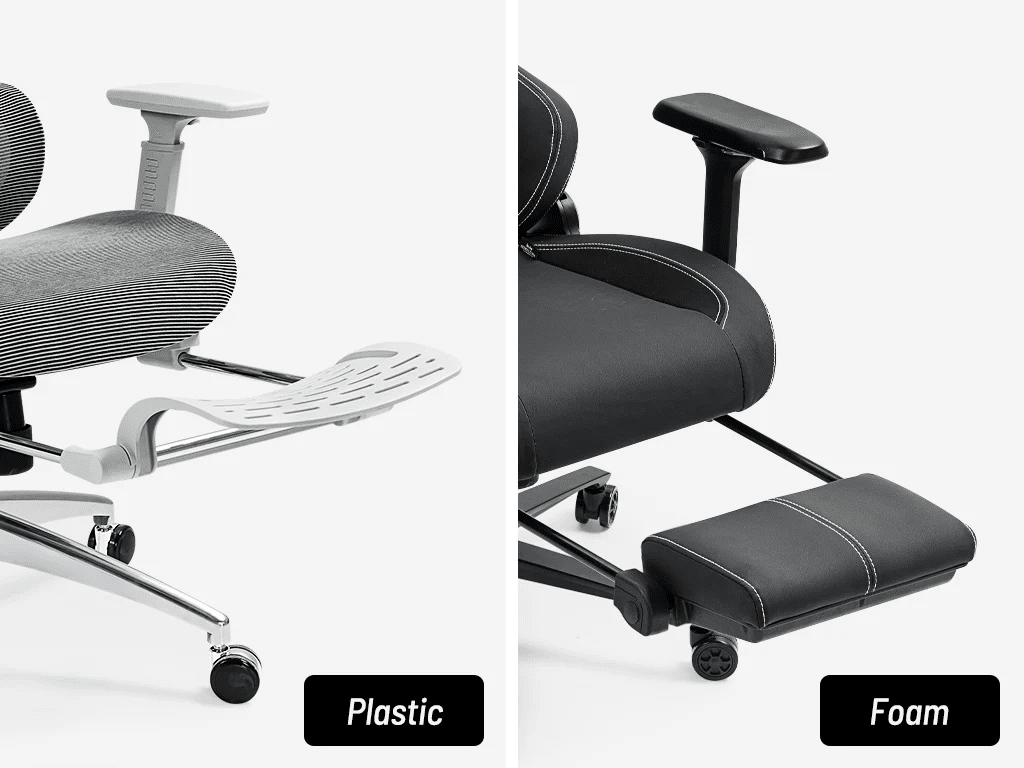 Reinforced plastic is a common material used in chairs. This material not only makes it easier to shape footrests into ergonomic shapes but also provides sturdy support.