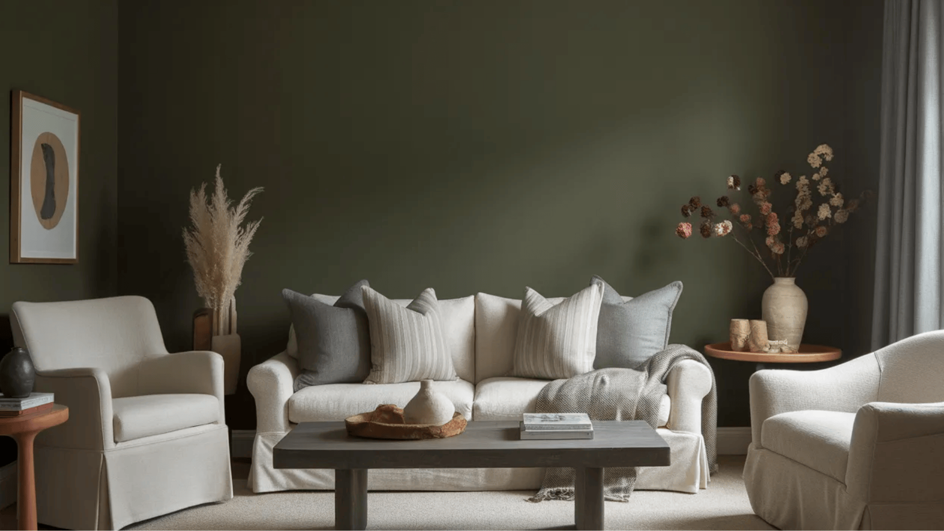 Shade Grown is a fantastic choice for living rooms. Its earthy green tone creates a calm, cozy, and inviting atmosphere, perfect for relaxation.
