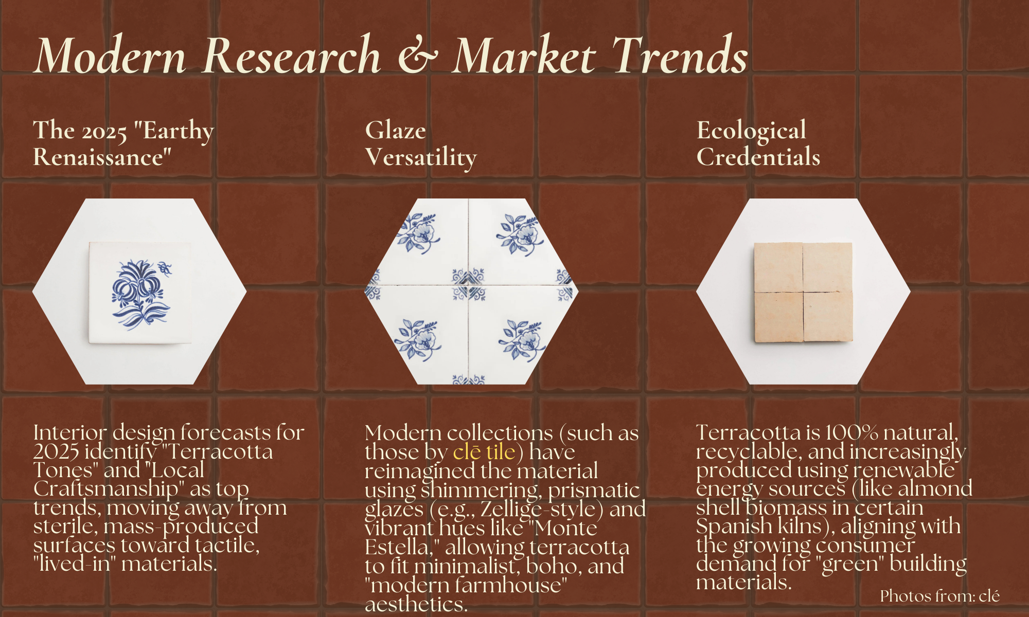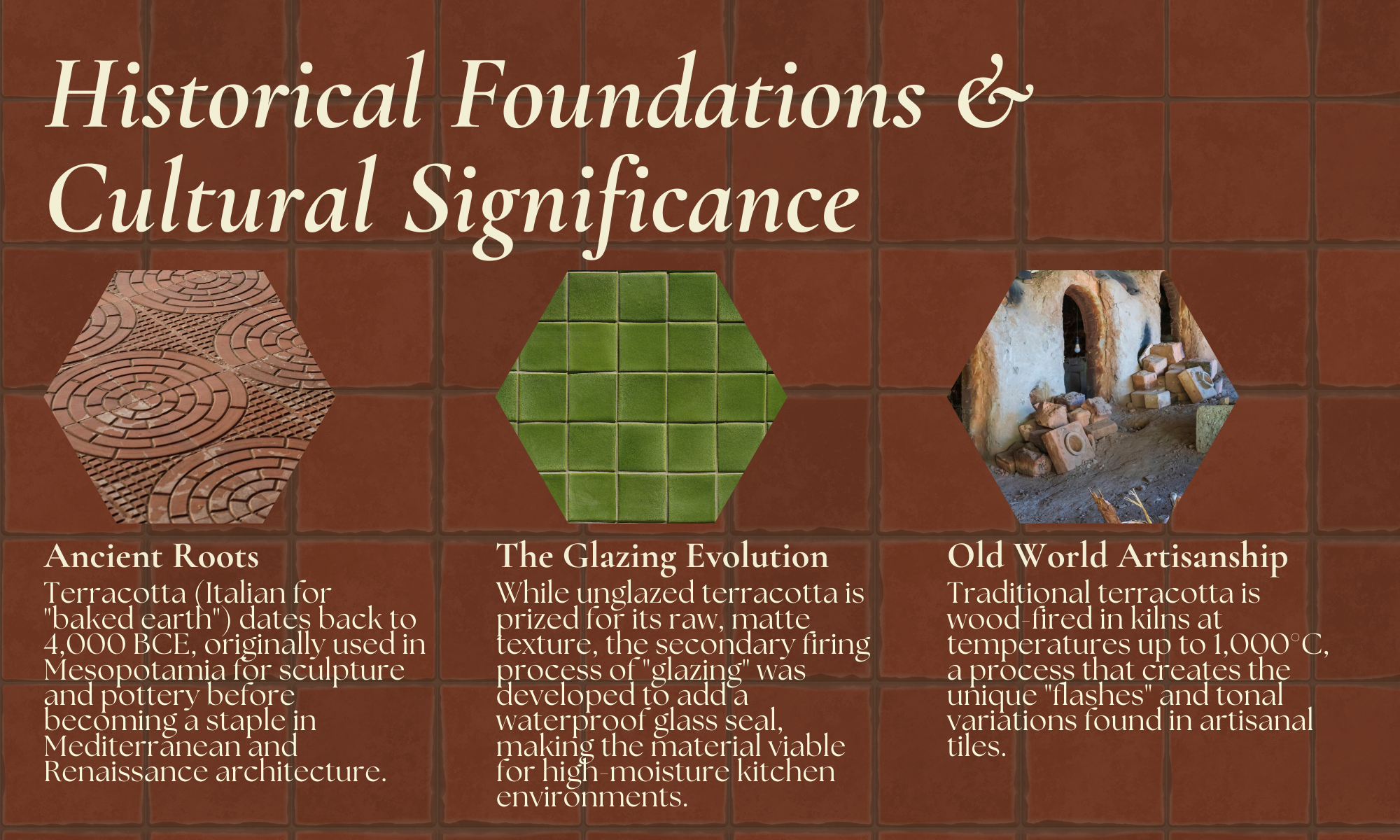 - Comfort: Terracotta stays cooler in summer and, when paired with radiant heating, feels wonderfully cozy in colder months.It’s also worth noting that glazed terracotta has sustainable appeal made from natural materials, often locally sourced, and produced in small batches using traditional methods.