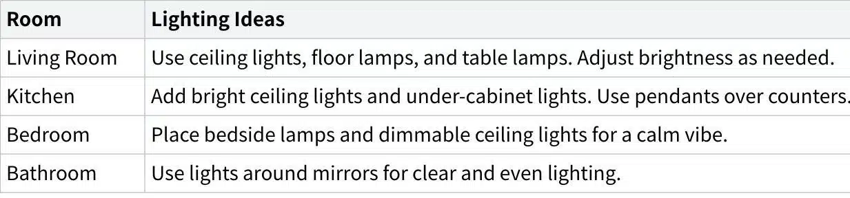 Accent Lighting: Highlights special items like art or decorations. It adds style and warmth.