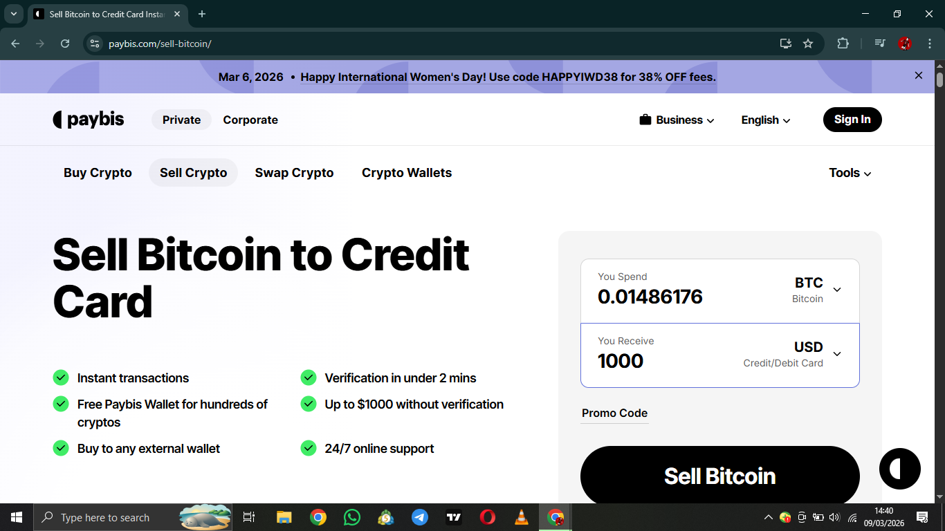 Paybis processes the transaction and deposits the fiat into your bank account or card. Card payouts can be processed within a few minutes, while SEPA bank transfers take about 2 days to complete, depending on your bank.