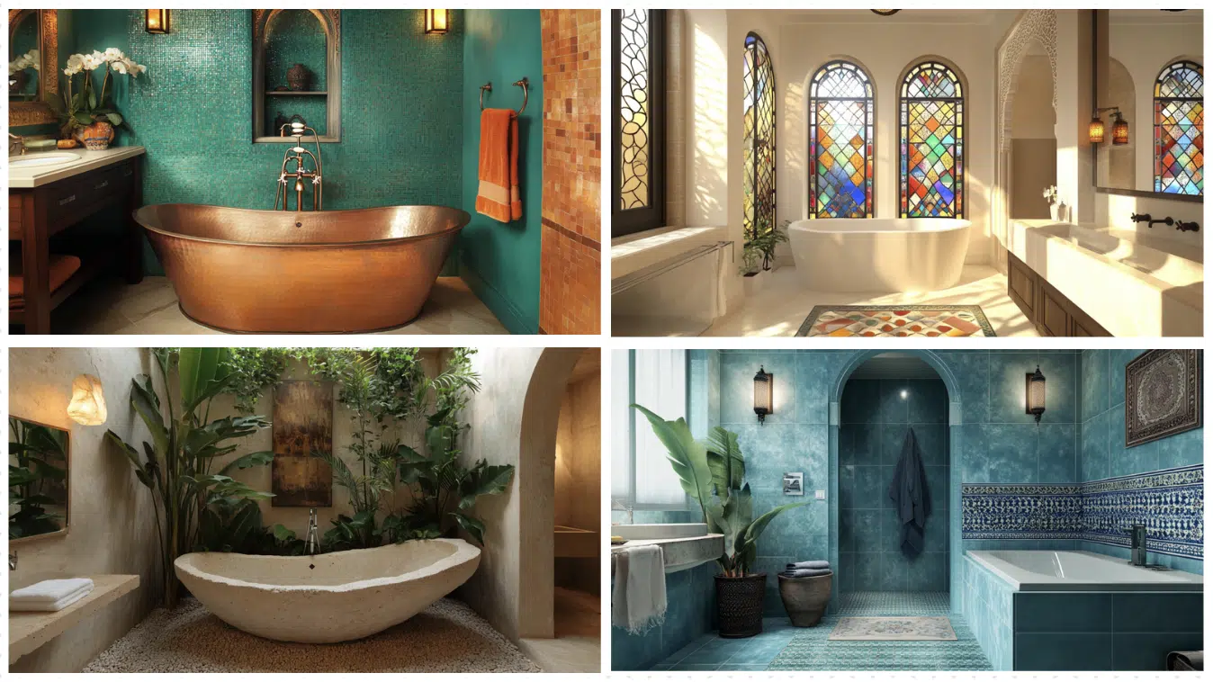 Design an open, airy bathroom with a central freestanding bath to recreate the feeling of a Moroccan courtyard. Surround the space with archways and green plants, mimicking Moroccan riads’ lush, serene courtyards.