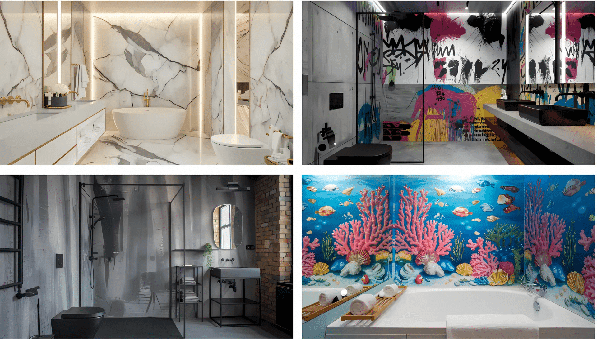 If you crave an urbane marble aesthetic, a vibrant tropical vibe, or a celestial dreamscape, there’s a design here to inspire your next bathroom changeover.