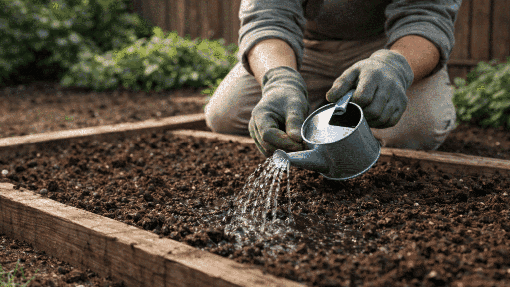 Using a gentle spray prevents seeds from shifting out of place. Regular but light watering keeps conditions stable for sprouting.